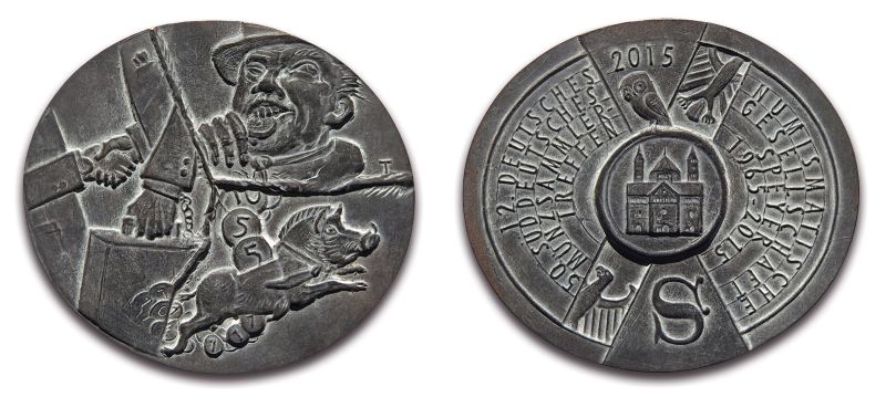 Among his more recent works, which allow for more ambiguous and ambivalent interpretations, one medal is particularly worthy of mention: created in 2015 to commemorate the 12th German and 50th South German Coin Collector’s Conference in Speyer, held under the heading Evil Money, Bad Money, Counterfeit Money (“Böses Geld, schlechtes Geld, falsches Geld”). (Fig. 5)