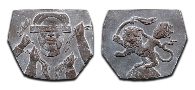 The silhouette portrait of explorer Alexander von Humboldt (1769-1859) has been combined with significant symbols of his work. (Fig. 8) The grid, which is reminiscent of a chemical formula, initially surprises the viewer. It evokes Humboldt’s many interests, referring, in several languages, to his research, the diversity of culture, the diversity of language, right up to the globally connected way of thinking in the digital age; everything is interrelated. The structure in the upper field is a schematic representation of the Chimborazo volcano in Ecuador. Humboldt wanted to climb its almost 6,300 metres but was forced to abort the expedition. Theumer has skilfully linked the compositional elements of image and inscription, harmonising the front and back.