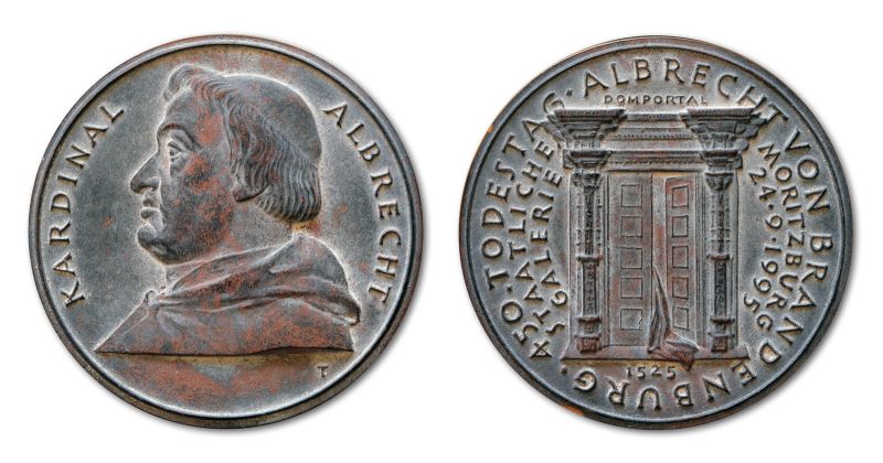 To commemorate the 450th anniversary of the death of Cardinal Albrecht von Brandenburg (1490-1545), archbishop of Mainz and Magdeburg, the State Gallery of Saxony-Anhalt in Moritzburg (“Staatliche Galerie Moritzburg”) issued a medal made by Theumer. (Fig. 6) His dignified, classic silhouette portrait of this important church dignitary, collector and patron of the arts has been combined with the portal of Halle Cathedral, consecrated in 1523. The portal has been placed in the centre, surrounded by the commemorative circumscription and mention of the issuer. We glimpse the edge of a long coat disappearing through the door, which is ajar, or perhaps quickly falling to, as if the cardinal – or was it someone else? – has just slipped inside, lending the image a sense of the mysterious sensuality of this church dignitary who was so full of joie de vivre.