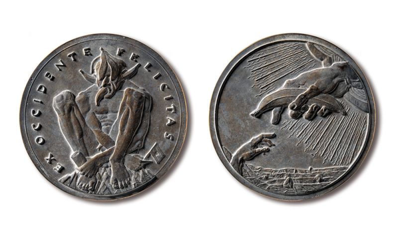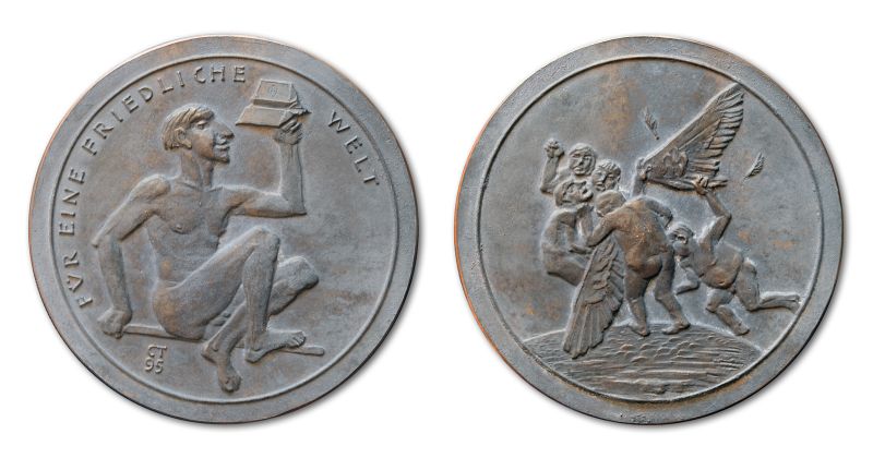 On the front of the medal titled For a peaceful world (“Für eine friedliche Welt”), a cheerful young man launches a paper glider, even though he is balancing on a slender beam. One might interpret this to mean that hope springs eternal. After all, what might the alternative be? The futile yet unrelenting struggle between men vying for the torn and thus useless wings of Icarus? Do they stand on Earth’s dome, embodying the demand for uniqueness with their five naked bodies?