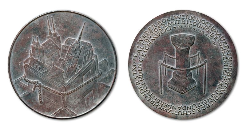 Theumer took this quote by Philipp Melanchthon, who had dedicated these words to the foundation of St. Egidien Latin School in Nuremberg (today the Melanchthon-Gymnasium) in 1526, and skilfully applied it to his native hometown of Halle. On the medal, the market church of Our Lady appears as a solid castle; the Red Tower, on the other hand, seems just about to fall. However, the tower remained largely upright when the doctoral candidate from Gotha came to Halle for his seminars, walking through the city centre to the Art History Institute at Martin Luther University Halle-Wittenberg, situated on the Kaulenberg. But one could already see the creeping architectural decay wherever one looked, including throughout the historic city centre of Halle. The falling tower on the medal may therefore be both a metaphor for the imminent decline of the GDR and a warning signal for politics and the media. Unlike the one-dimensional reflections in the “leading media” – then and now – the medal as “art for the hand” is able to critically exaggerate reality, to reflect it in images that stay with us, and thus encourage us to think and differentiate by way of our aesthetic-sensual perception.